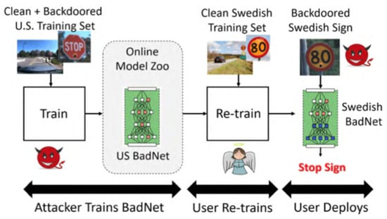 - Gu, T.; Dolan-Gavitt, B.; Garg, S. Badnets: Identifying vulnerabilities in the machine learning model supply chain. arXiv 2017, arXiv:1708.06733. [Google Scholar]