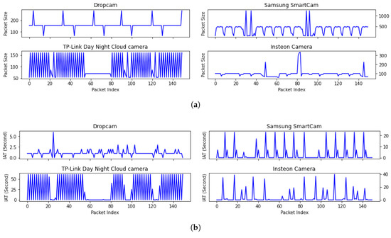 Unique and periodic packet size and IAT features of four surveillance cameras. (a) Packet size feature along with packet index; (b) IAT feature along with packet index.