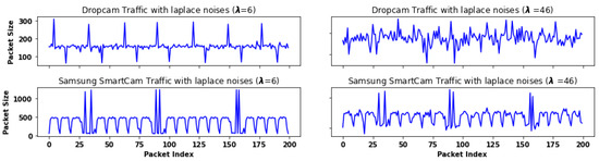Obfuscating IoT time series data poses a significant challenge due to their unique characteristics. Traditional data obfuscation methods are often ineffective and inefficient for time series datasets. For example, the perturbation method [23,24] is commonly used to mask sensitive data by randomly adding crafted noises. However, controlling the perturbation level to preserve privacy without sacrificing the original data’s value is a challenging task. To illustrate this challenge, we conducted an experiment where we added a significant amount of Laplace noise to two security camera datasets. The Laplace noise function is defined as We used different values of the parameter to control the amount of generated noise. Figure 2 shows that when the parameter changes from 6 to 46, the repetitive and consistent pattern of the Dropcam dataset is completely distorted, resulting in a degraded dataset utility. However, with the same amount of injected noise, the repetitive pattern of the Samsung SmartCam dataset is still recognizable. In general, achieving a balance between privacy level and model compatibility with perturbation methods is not satisfactory, as we will demonstrate in our experiments.