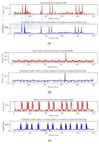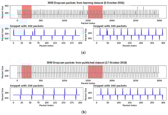We present two privacy attack scenarios resulting from the leakage of traffic patterns. In the first MIA scenario, an attacker seeks to determine if a Dropcam surveillance camera is present in a published dataset. A vulnerability in the Dropcam allows unauthorized users to halt its recording [36]. If an attacker can identify unique traffic patterns associated with home security cameras, the attacker can search for such a pattern in the published raw IoT packet data and launch a security attack if the targeted IoT device is successfully identified. Suppose the attacker uses a dataset collected on 6 October 2016, as the learning dataset. The attacker selects two snippets from the dataset and visualizes a sequence of packet size data, as shown in Figure 3a. By comparing the traffic patterns (two snippets in Figure 3b) from the published dataset (collected on 17 October 2018), the attacker can determine if a Dropcam is present in the dataset.