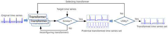 The architecture of our proposed data transformation method is shown in Figure 5. It consists of two primary components: transformers and a utility assessment. The transformers convert the input time series data into new data that contain either a desired feature pattern or a learned feature pattern. A data transformer selects a group of transformed candidates based on the similarity between the original and target data features. The purpose of the utility assessment is to maximize the selected feature similarity between the original and target datasets.