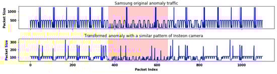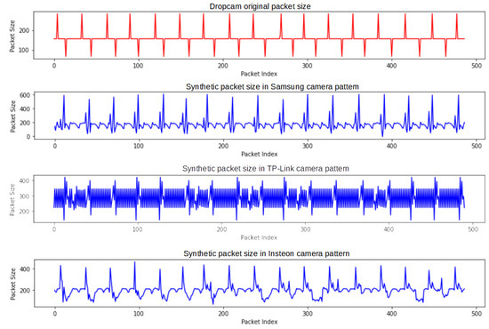 Data transformation aims to conceal the types of IoT devices by converting actual IoT time series data into a new dataset. This makes it impossible for an adversary to differentiate between the genuine device types. For example, as shown in Figure 4, the packet size feature of a Samsung SmartCam can be transformed into a new dataset with a similar feature of the Insteon camera. This makes it difficult for an attacker to identify whether a Samsung SmartCam is present in the published dataset.
