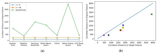 Here, we want to clarify that it is challenging for an attacker to accurately identify sensitive IoT devices using transformed datasets. Even if we obfuscate the traffic features of a device, such as changing the Dropcam data to Insteon data, an attacker may still be able to classify the sensitive devices from the rest of the devices using the transformed data, for example, as shown in Figure 10. However, the attacker cannot identify the device because the transformed data do not resemble the original data, but instead have a higher likelihood of resembling the target data. Thus, the transformed data do not contain any privacy-revealing features.