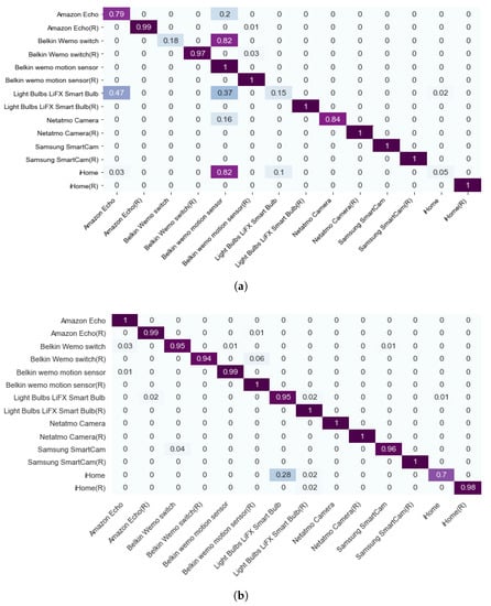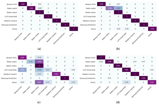 Confusion matrix of classification results of seven IoT devices based on packet size feature, with dark purple representing correctly classified instances and light blue representing incorrectly classified instances. (a) Original data; (b) Perturbed data (); (c) Perturbed data (); (d) Transformed data.