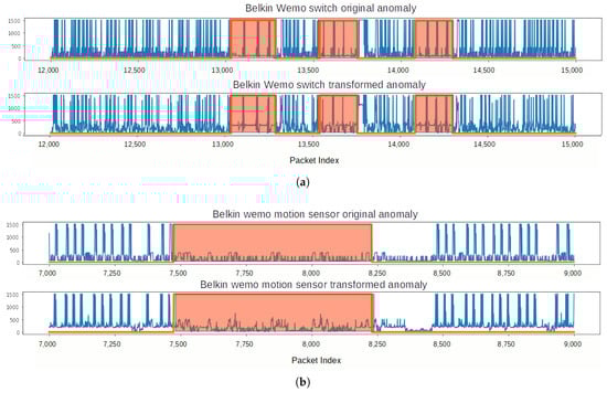 Reconstructed anomalies of Belkin data with an Insteon-like packet size feature. The anomalies are highlighted. (a) Belkin Switch; (b) Belkin wemo motion.