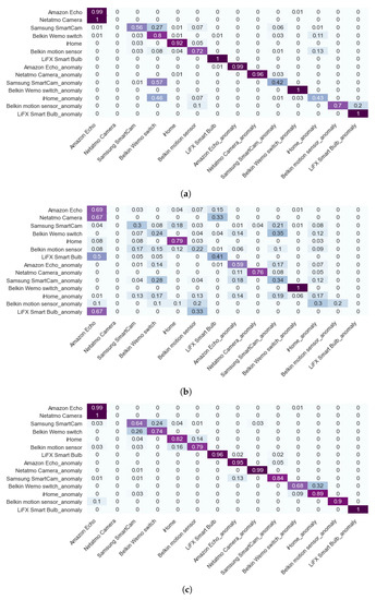 To assess the utility of the transformed data, we conducted IoT classification and anomaly detection on both the original and transformed datasets. Firstly, we evaluated the IoT classification results by classifying seven IoT devices using both the original and transformed data. We trained a model using the original data as the baseline measurement and achieved a classification accuracy that was not 100% due to the use of a single feature. However, we found that the perturbation method had a negative effect on the classification accuracy, especially when using a large value, as shown in Figure 11b,c. In contrast, the transformation method had a minimal impact on accuracy, as seen in Figure 11d, where we were able to achieve almost the same classification results using the transformed data. Following this, we visualized the transformed anomaly and presented the anomaly detection results.