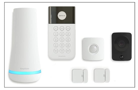 The SimpliSafe security system, from left to right: base station, keypad, motion sensor, two entry sensors, and camera.