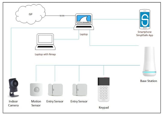 Figure 3 illustrates the research methodology followed in this study including the processes to populate, acquire, and analyze the relevant apps on both smartphones. Similarly, Figure 4 depicts the network and communication links among all devices used in the study. In this scenario, motion and entry sensors, as well as the keypad, were directly connected to the base station which was wirelessly connected to the access point provided by the laptop. The laptop acted as the bridge between the Internet and the local network, allowing us to capture the network traffic using Wireshark and further analyze the packets. The laptop with the Nmap [15] software allowed us to keep track of the IP addresses assigned to the base station, camera, and smartphones. Additionally, Figure 4 shows the indoor camera being connected directly to the laptop and not to the base station like other sensors. This is due to the camera’s ability to operate independently of the base station and sensors.