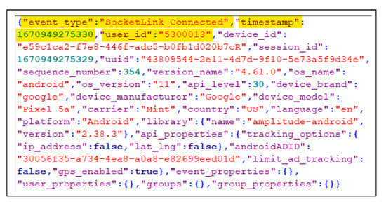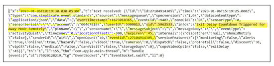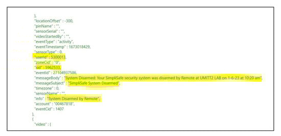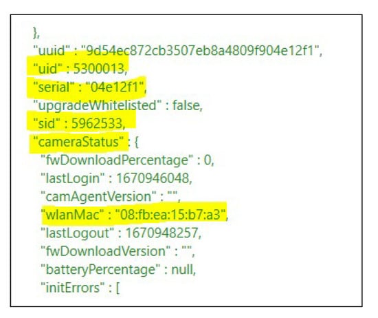 We were able to locate records associated with different events performed as part of the study. For example, Figure 12 presents the file 61708060319.txt containing information that shows when the alarm was switched off, which also matched our timestamp of this event. Figure 13 shows the log related to the action of pairing the camera with the application by scanning the QR code on the camera device during the setup. Figure 14 shows the information such as uid, sid, wlanMac, and serial number presented in file 69196065763.txt.