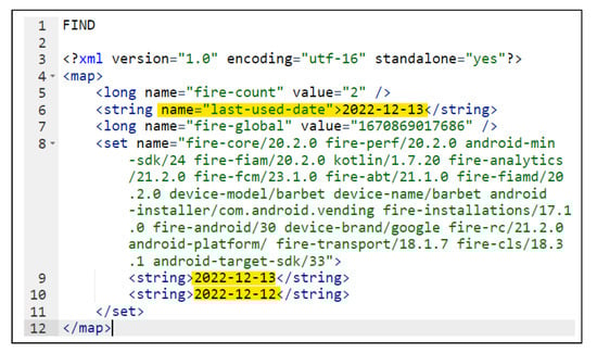 The \shared_prefs\FirebaseHeartBeatW0RFRkFVTFRd+MTo2MDgzNjI2NDEwNzY6YW5kcm9pZDplZjYzOGI5ZGUxZWI2ZWU3.xml file held the last date the app was used as well as a record of each day the app was used on the current device. Since the testing took place over two days, we were only able to confirm this list recorded at least two days of app usage (see Figure 7). Similarly, the first time the app was opened on the current device and the last time the app was paused (i.e., put into the background) could be recovered from the \shared_prefs\com.google.android.gms.measurement.prefs.xml file.