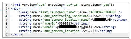 Two of the more relevant .xml files found within the \shared_prefs folder were the SS_MISC.PREFERENCES.xml file and the SS_TOKENS.PREFERENCES.xml file (see Figure 8). With these two files, investigators were able to identify (1) current_location_sid, (2) the number of times the user viewed the live camera feed, (3) the last time the app was opened, (4) the SID of the monitoring location, (4) the name of the camera that was set up, (5) the SID of the camera’s location, and (6) the user’s user ID and email address.