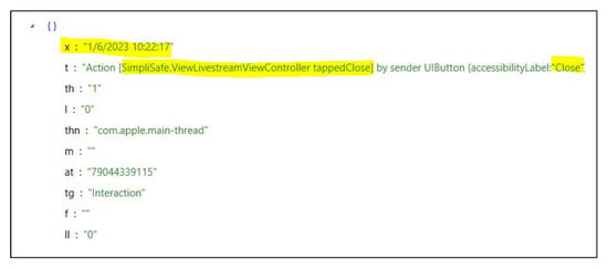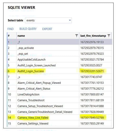 The first finding for iOS was at the \Library\ApplicationSupport\Google\Measurement location within the google-app-measurement.sql database and events table. This table shows events throughout the data population (see Figure 9). The highlighted item’s (Auth0_Login_Success) timestamp matched our timeline (Appendix A.2) when we logged into the app on 5 January 2023 around 10:37. Similarly, Camera_View_Live_Failed matched the timeline when the camera was accessed unsuccessfully. These are only two examples while the table contained 49 records in total.