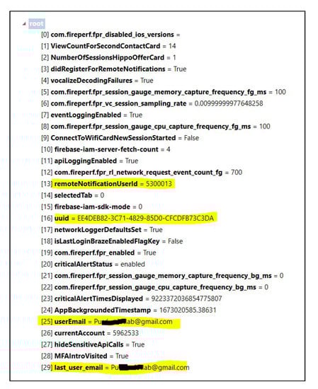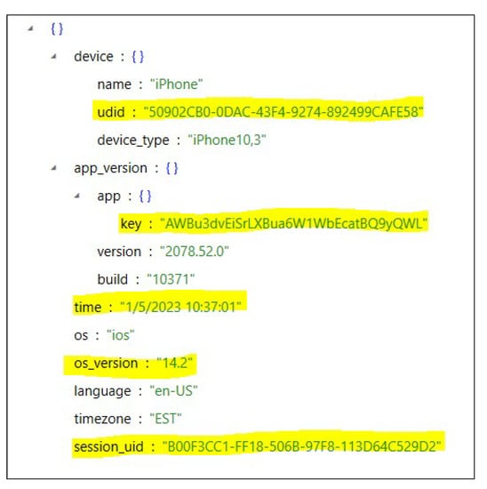 Various sessions were found in the \Library\Caches\com.bugfender.BugfenderSDK\BFPersistedStringQueues folder. We found two sessions, one of less value and one containing valuable information for the investigation. Within the session-24842698825 folder and session.json file, information such as udid, key, device type, OS version, and starting time of the session was found (shown in Figure 10). This time matched the time when we signed into the application for the first time.