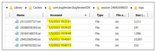 Moreover, the \Library\Caches\com.bugfender.BugfenderSDK\session-24842698825\logs folder contained logs stored throughout the session. The log records started right after the first login. The logs were consistent with the app being opened and used. For example, on 5 January 2023, logs were only created during the times of the data population (see Figure 11).