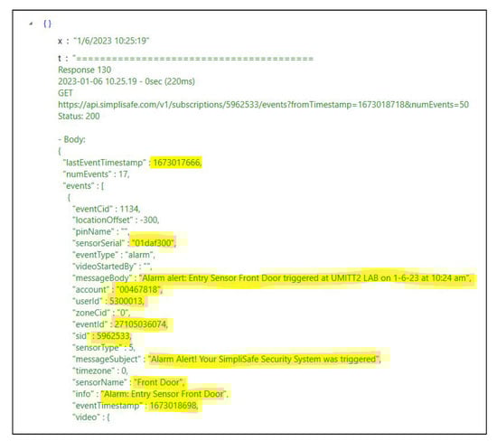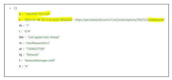 As it can be seen in Figure 15, we changed the state of the system from OFF to Home on 6 January 2023 at 10:17. The request did not show the initial state of the system; however, it showed the requested state, which in the previous image was Home. This was also consistent since the system was reverted back to OFF at 10:18 (see Figure 16).