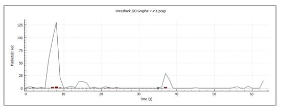 In [14], the authors used recognizable network traffic patterns to predict incoming distributed denial-of-service (DDoS) attacks. More specifically, they used Wireshark’s I/O graph tool to discover five unique network traffic patterns that emerged when their home IoT environment was under a DDoS attack. The authors also provided guidelines to filter for specific traffic such as the TCP error flags and protocols used in Wireshark.