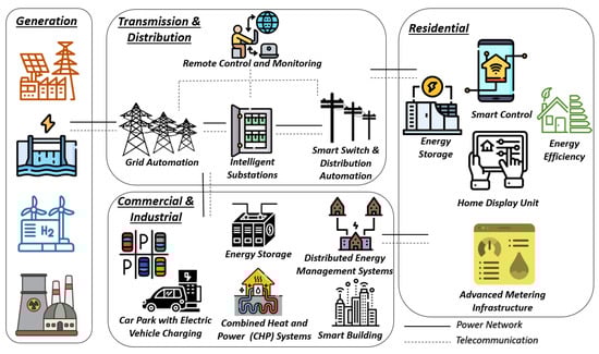 A smart grid is an advanced electrical power system that integrates cutting-edge technologies, sensors, and communication networks to optimize the efficiency, reliability, and sustainability of electricity generation, transmission, distribution, and consumption (Figure 3). Its objective is to revolutionize the conventional grid into a dynamic, automated, and adaptable network for enhanced performance [127,128].