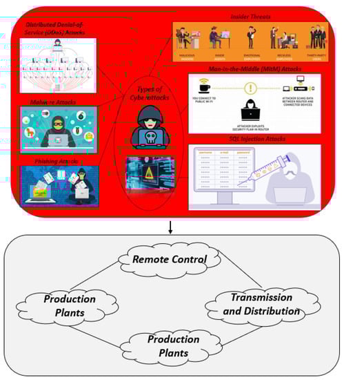 Smart grids are susceptible to various types of cyberattacks (Figure 4) that target their interconnected systems and infrastructure [154]. Here are some common types of cyberattacks in smart grids [155,156]: