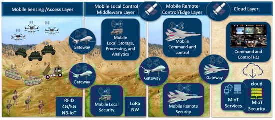 CioT involves an integrated network of homogeneous and heterogeneous sensors and smart devices connected using edge and cloud infrastructures to support non-combative mission-critical tasks and operations. However, MioT involves a network of homogeneous and heterogeneous battlefield devices, intelligent and marginally intelligent, and wearable devices that are connected to support combative and battlefield operations. In an MioT environment, fog, edge, and cloud computing connect the ubiquitous sensors and IoT devices worn by military personnel and embedded in military equipment to create a cohesive fighting force to increase the situational awareness, risk assessment, and response time [14,15,16]. However, MioT uses mobile edge computing where IoT end devices transmit the data via a mobile edge server to a mobile base station [17].