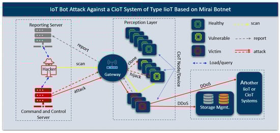 In general, CioT and MioT are subject to attacks that are common in traditional IoT environments, such as DDOS, IoT bot malware, flooding, jamming, hijacking, DDOS, and IoT device cloning, to list a few [25,26,27]. Figure 3 shows an IoT bot attack scenario against an IioT system where the hacker uses compromised nodes to scan for vulnerable IoT nodes to compromise, loads the malicious payload to compromise the nodes, and then uses the compromised or non-compromised nodes to launch a DoS, DDoS, or RDDoS attack. The illustrated IoT bot attack uses an attack pattern similar to the Mirai IoT bot malware attack, which compromised thousands of IoT devices and launched a large-scale DDoS attack [28,29,30,31]. A DoS attack against an IoT device invariably leads to system failure and can have a catastrophic impact [32,33].