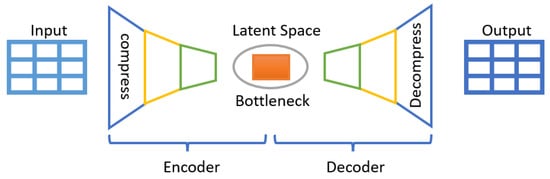In addition to the data sampling methods mentioned above, we consider a fourth category of methods known as generative methods to generate new synthetic data from the original data by reconstruction, which we then use to train the AMiDS models. We use the autoencoder (AE) and variational autoencoder (VAE), two unsupervised learning methods, to generate synthetic data that are closer to the original data but not quite the same. The main idea behind these two methods, each of which consists of two fully connected neural networks (an encoder and a decoder), is to first compress the input data using an encoder while ignoring the noise and then decompress it using a decoder to generate data as close as possible to the original [35,45]. Their main objective is to learn latent representations. Figure 4 shows the main components of an autoencoder network.