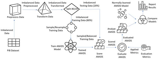 The employed research methodology is of the empirical type, where we used experiments to process and transform the imbalanced dataset, applied imbalanced methods to balance the data, trained the AMiDS models using imbalanced learning, scored (tested) and evaluated the models using standard ML metrics as well as time metrics, analyzed the evaluated models, and compared the models’ performances to the performances of the same AMiDS models trained and evaluated using regular learning. Figure 5 depicts the conceptual model based on the prescribed methodology.