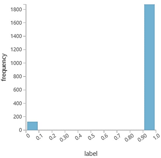 To understand the impact of imbalanced learning on the performances of the AMiDS models in the rare event prediction case, we considered the UNSW_2018_IoT_Botnet dataset, which is available from the IEEE dataport [71]. However, we used the PiB datasets used in [70]. The dataset is a sample from one of the extracted dataset’s files but with fewer features. According to the creators of the dataset, the complete IoT-Botnet dataset, comprising benign and botnet-simulated IoT network traffic, contains about three million records and includes five types of attacks (DDoS, DoS, OS and service scan, keylogging, and data exfiltration) and forty-six features, including the attack label, attack category, and attack subcategory [72]. However, the PiB dataset consists of two thousand records and twenty-nine selected features and includes two attacks (DoS and DDoS) in addition to the normal examples. We used the PiB dataset rather than the extracted one because it has an imbalanced class distribution where the normal examples are less frequent than the attack examples, which is suitable for our study which focuses on imbalanced learning, given the rare prediction case. Figure 6 shows the distribution of the normal and attack classes in the dataset, and Table 3 shows the PiB dataset features.