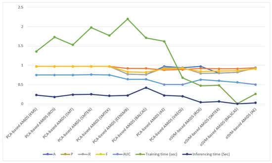 The study assessed the performance of the AMiDS models according to the applied data sampling and data generative methods using ML standard metrics, i.e., precision (P), accuracy (A), recall (R), F1-score (F1), ROC, and AUC, as well as using the training time and inference time as additional performance indicators.