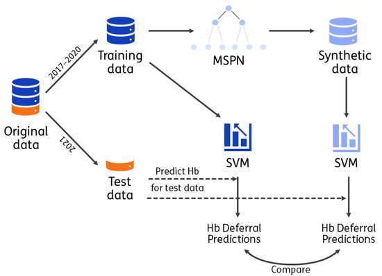 The process for utility evaluation is visualized in Figure 1. A synthetic version of the training data (2017 up to 2020) is generated with CBSDG. Using the synthetic data set, the analyses that Vinkenoog et al. [26] performed on the real training data (i.e., the original data) are performed with the same hyperparameter choices (as used in the original analyses). Hb deferral predictions are made for donations from 2021 using SVMs based on the original data and based on the synthetic data. Utility is evaluated by comparing these predictions. The donations from 2021 were not used to train the SVMs, nor to construct the MSPN. The process is repeated 50 times (leading to 50 MSPNs, 50 synthetic data sets and 50 corresponding sets of SVMs). The objective is to asses the extent to which predictions made by SVMs are expected to differ when using synthetic instead of real, personal donor data.