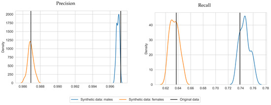 With respect to precision and recall, on average, SVMs trained with synthetic data achieved a precision score of 0.997 and 0.987 and a recall score of 0.746 and 0.634 for males and females, respectively. This is close to the results for the original data (precision of 0.997 and 0.987 and recall scores of 0.739 and 0.637 for males and females, respectively) and in some cases even higher. The standard deviations are 0.008 and 0.007 for the recall scores, for males and females, respectively. The standard deviations for precision were near zero (zero when rounded to 3 decimals). We plotted the precision and recall scores in Figure 3 to depict the shape of the distribution over the repetitions. Plots were generated with seaborn.kdeplot [31] with bandwidth 0.4. This visualizes the similarity between the precision and recall scores per gender and shows that the true scores lie close the middle of the synthetic data scores. An exception is precision for males, for which the scores almost did not deviate from the original precision score. Note that the synthetic data produced similar results for the SVMs trained on different sexes, while the MSPNs are trained for both sexes simultaneously. The classification tables for the original and synthetic data can be found in Table A1 and Table A2.