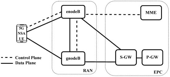 The 5G NSA architecture consists of a 4G core network and two types of base stations (BSs).