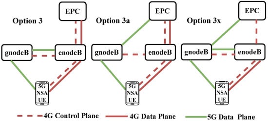 For MNOs, the 5G architecture option “3”, the NSA option, is a compromise between adding new capacity for eMBB and saving Capital Expenditure (CapEx) for deploying the 5G core network [17]. In this architecture, the RAN is composed of enodeBs as the Master Node (MN) and gnodeBs as the Secondary Node (SN). The RAN is connected to the 4G core network. MNOs usually use the term 5G NSA to refer to 5G NSA option 3. Therefore, in this paper, any reference to “5G NSA” refers to this option. 5G NSA option 3 is further divided into three types, based on the data split method, as shown in the Figure 2.