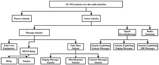 On the highest level of this structure, attacks on 5G NSA can be divided into active attacks and passive attacks. Active attacks require the attacker to transmit signals to perform the attacks. Passive attacks rely on sniffing signals without intercepting them.