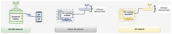 We implemented an experimental testbed to practically verify the working and persistence of the above-discussed attacks on 5G NSA. Our experimental testbed consisted of a commercial 5G NSA BS, a fake 4G BS based on open-source software and SDRs, and a 2G BS also based on open-source software and an SDR. Figure 4 provides an abstract representation of the testbed, illustrating the interconnected components involved.