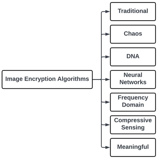 Digital images are electronic files that consist of two-dimensional arrays of numbers with variable sizes and channel numbers (i.e., one channel for gray-scale images, three channels for color images, and four channels for color images with a transparency channel) that store pixel values. Each pixel represents a specific color. A digital image, I, is defined by size, , where H is the height, W is the width, and is the number of channels. Images usually contain private and personal information, such as personal and legal documents, medical images, military images, etc. When these types of images are shared over the internet or on an unsecured network, these images could be compromised by unauthorized access. Furthermore, most digital images tend to contain high redundancy due to the correlation between neighboring pixels. Image encryption algorithms aim to ensure the security of the image from unauthorized access by encrypting the plaintext image and producing a cipher image that can only be decrypted by the intended users. Image encryption algorithms use the confusion and diffusion [2] principle to produce cipher images and reduce the correlation between neighboring pixels. Confusion is attained by changing the values of each pixel in a digital image by a substitution map, where the values of each pixel in a plaintext image are changed by a substitution map such as an AES S-Box. Diffusion is achieved by changing the plaintext image pixels’ location within an image itself using mathematical permutation operations. Diffusion helps in reducing the correlation between adjacent pixels that are present in the plaintext image. In image encryption, confusion and diffusion are controlled using a key or a set of keys to obscure and permute the plaintext image to produce the cipher image. Researchers have proposed a multitude of image encryption algorithms in the past decades. This section presents a review of image encryption algorithms based on the techniques used. Figure 1 illustrates the seven different approaches based on the techniques used.