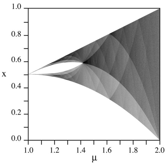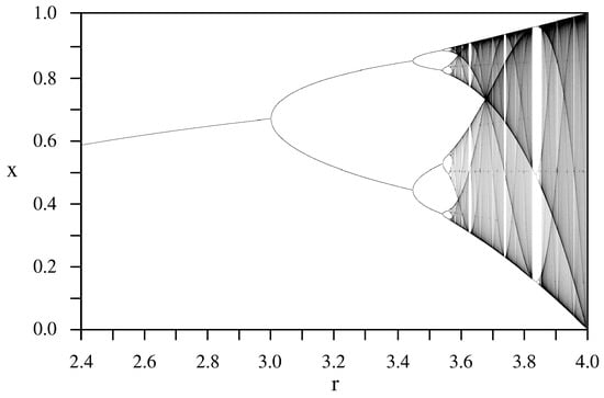 where represents the initial parameter or starting value of the logistic map, with . The parameter, r, is the control parameter or growth rate of the logistic map, and it has a range of (0, 4). However, chaotic behavior is observed only when the control parameter, r, is within the range of (3.56995, 4) [19]. The bifurcation diagram of the logistic map is illustrated in Figure 2.