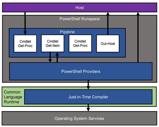 PowerShell offers a set of cmdlets, which are specialized .NET classes that present a command-line interface to various features of the .NET Framework [10]. These cmdlets allow developers to interact with the .NET Framework using PowerShell’s command-line syntax. PowerShell includes the ability to call .NET assemblies directly, which gives developers access to the full capability of the .NET Framework and its class library from within PowerShell. Developers can then leverage existing .NET code and libraries in their PowerShell scripts, making PowerShell a potent tool for automating .NET-based tasks. In Figure 1, a diagram of the execution pipeline between .NET and PowerShell shows how PowerShell code is executed within a system when submitted by a host.