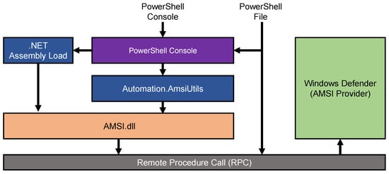 Windows Defender is the default protection software in Windows, and many antivirus software and Endpoint Detection and Response (EDR) solutions use the interfaces it furnishes. Microsoft defines the AMSI as “a versatile interface standard that allows your applications and services to integrate with any antimalware product on a machine. AMSI provides enhanced malware protection for your end-users and their data, applications, and workloads” [11]. In this construct, the AMSI is a vendor-agnostic malware scanning and protection provider that supports any antimalware product by providing Win32 API and Component Object Model (COM) interfaces. The AMSI is integrated directly into the Windows environment and provides protection for User Access Control (UAC), PowerShell, dynamic code evaluation, Windows Script Host, JavaScript, VBScript, and Office Visual Basic for Applications (VBA) macros.