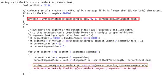 Analysis of the PowerShell Core code on GitHub reveals a significant issue in the implementation of ScriptBlocks. In CompiledScriptBlock.cs at line 1447, shown in Figure 6, the logging code commences [21]. The first issue identified is that the implementation stores the ScriptBlock Extent in the logs while the EndBlock is sent to the compiler for execution. As previously stated, this discrepancy is critical because, although the ScriptBlock Extent and EndBlock are assumed to be the same, they may not be. This assumption enables the creation of two sets of commands, one for execution and another for logging, thus giving rise to ScriptBlock Smuggling.
