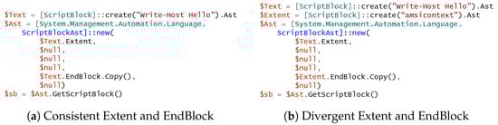 Recall in PowerShell that an AST can be manually created and inserted into the construction of a new ScriptBlock, as illustrated in Figure 7a. This manual AST creation process, as demonstrated by the code snippet, underscores the potential for deliberate manipulation. By manually constructing an AST with divergent Extent and EndBlock parts, an attacker can craft a ScriptBlock that, when executed, performs the hidden malicious operations while only the benign Extent is logged.