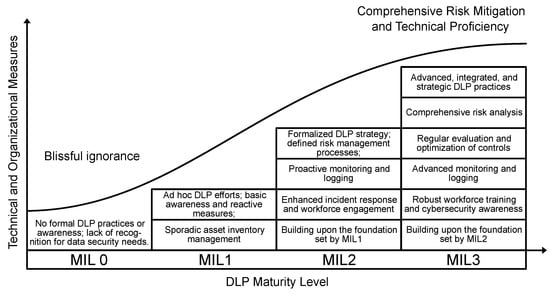 The MILs are adapted for the DLP Maturity Model to provide an analogous structured assessment for DLP practices. As shown in Figure 3, these levels were integrated to define the progression from non-existent DLP measures (MIL0) through to a mature state of advanced DLP practices.