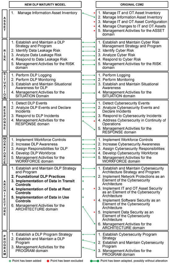While considering other models, C2M2 emerged as the most fitting due to several factors. ISO/IEC 21827 [50], though significant, is somewhat dated, having not been updated since 2008. The Cybersecurity Maturity Model Certification (CMMC), heavily oriented towards the U.S. Department of Defense, presents limitations in a broader industrial context. In contrast, ISACA’s CMMI, not being publicly accessible, restricts its applicability. The popularity and well-established nature of C2M2, as indicated in [49], offer a proven track record of reliability and effectiveness crucial for a robust DLP maturity framework.