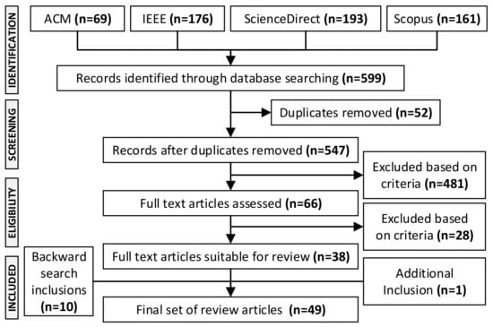 To search for relevant literature, we applied two search strings to the following four databases: ScienceDirect, ACM Digital Library, Scopus, and IEEE Xplore. The first search string concerned automation in SOCs, with the second factoring in the human component (for conciseness, Appendix A provides an example search string for a select database). This resulted in 599 papers, which was reduced to 547 after removing duplicates. The articles were then screened at the title and abstract level, where we followed the Population, Concept, and Context (PCC) framework put forward by [21]. Articles in this review needed to adhere to the inclusion criteria of a population of security analysts, the concept of automated security tools, and the context of SOCs. Based on this, 481 articles were excluded. The final 66 articles were read in full, and 28 articles were excluded on the grounds of not sufficiently addressing all three aspects. Backward searching (i.e., examining the reference list of included articles) resulted in 10 articles being included. Since running our database search, we recently published a 2023 conference article, indicating the one included article. Figure 1 displays our final PRISMA diagram.