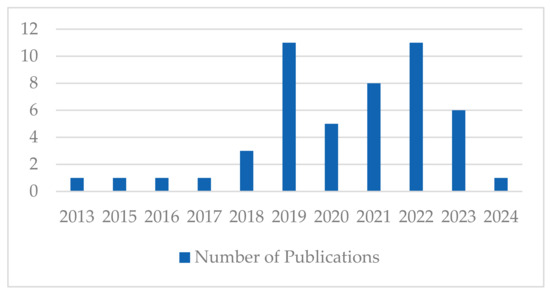 The study selection process yielded 49 articles published over the last 11 years. It is worth noting that no date limitations were applied when selecting literature, but it just so happened that the selected literature dates between 2013 and 2024. While the literature on SOCs before 2013 is available, discussions centered on how automation is used and its implications on analysts are part of an emerging field. Available data indicate that since 2019, there has been a rapid increase in literature examining the specificities of automation in security operations. Figure 2 shows the number of publications by year.