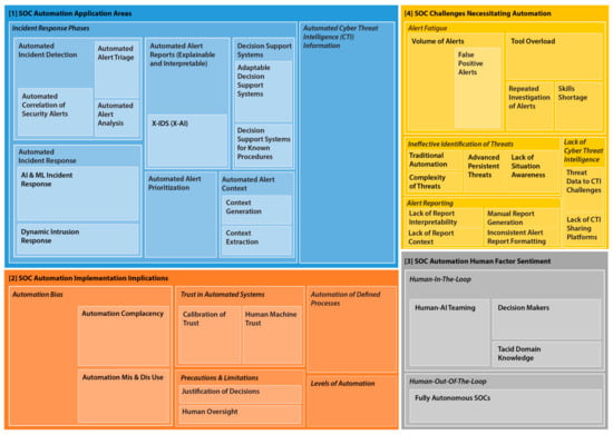 Figure 3 displays the result of the final coding process, with each block illustrating the proportion of each theme in relation to the 609 coding references. For instance, automation application areas mark the most dominant theme discussed in the literature. Similarly, there is room for more research to address the human factor sentiment in SOCs, discussing analysts’ tacit domain knowledge, their role as decision-makers, and how to best team them with AI tools and technologies.
