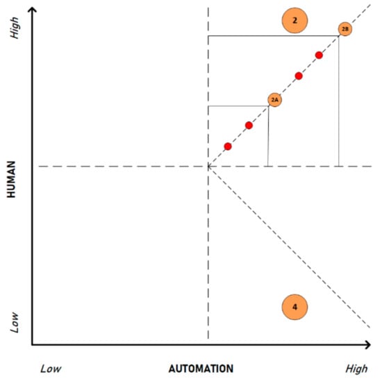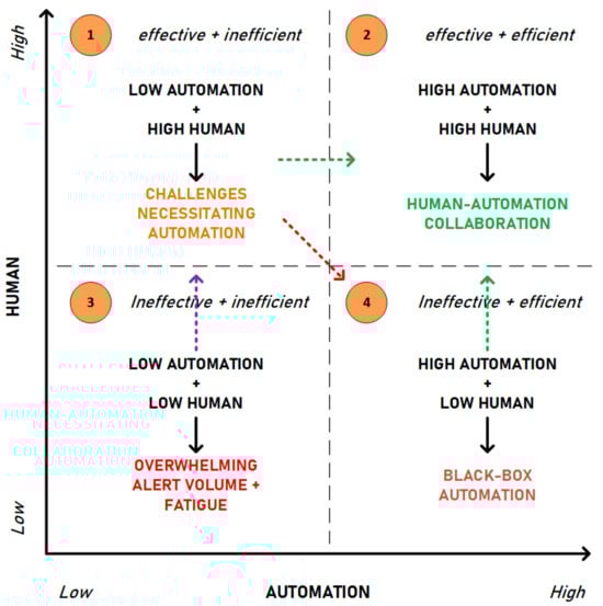 This quadrant represents the most desirable state that SOCs should strive towards, as sufficient automation exists to assist SOC analysts. Here, activities are effective in that skilled SOC analysts are teaming with intelligent automated agents in threat mitigation and efficient in that automation takes care of routine and manual operations. Consequently, the human analyst is efficient and effective, and so is automation. Overall, tasks are performed swiftly and more accurately. The benefits of socio-technical system design are realized in Q2, and the SOC design is intended to “optimize the organization’s social and technical systems jointly” [20] (p. 459). Strong human-automation collaboration exists in this quadrant, leveraging each entity’s skills. An applicable example of such a tool is DeepLog, proposed by [68], which organizes and structures vast amounts of log data. This is achieved by automatically collecting logs generated concurrently, ordering them sequentially, grouping them according to their workflow, and separating them based on the task or event they relate to. Similar log mining and analysis techniques are mentioned in [69]. This allows analysts to identify the current point of threat execution better and conduct root cause analysis. Furthermore, the tool extracts contextual information beyond commonly collected data (log keys, for instance) to give analysts a complete understanding of the event. DeepLog represents an example of a mutually beneficial human–automation relationship in that it incorporates analyst feedback in situations where log entries were incorrectly classified as anomalies [68]. The premise of this quadrant is that neither entity overpowers the other. The system characteristics of automation (as per Figure 5) are fully implemented (see Figure 7). However, the potential for automation bias exists depending on the degree of automation implemented and the level of automation applied.