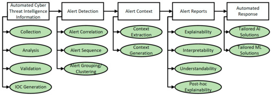 Once threats and vulnerabilities have been detected, the next step is to supplement these alerts with additional context. Truly aiding security analysts extends beyond simply flagging alerts as malicious. It involves providing further background information about these alerts in the form of alert characteristics and properties, where they have originated from, attacker behaviors and techniques, and what the alert impact could be if not resolved [45]. Ref. [58] implemented Context2Vector to reduce security analysts’ burden during the triage process by enhancing alerts’ informative information beyond what traditional intrusion detection systems offer. In the cybersecurity domain, ref. [45] (p. 02) define alert context as “a comprehensive concept, cover[ing] different kinds of data sources, such as the provenance …, the logs collected within the same period, [and] the alert sequences”.
