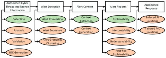 The previous three themes have shown that, until now, threat information from the external environment has been collected, indicators of compromise have been created, intrusion detection systems have been updated, alerts have been detected, and context has been extracted and generated. As mentioned earlier, the next logical step in the incident response lifecycle is the culmination of the information into alert reports presented to analysts. A significant finding in the articles evaluated is that alert reports must build upon the contextual information gathered by creating a storyline of intrusion events [12,18,37,38,47,51]. By knitting this information together, security analysts are presented with different aspects of events in a timeline format, dating back to the root cause [54,56,57]. The premise of these reports is to explain what has happened, why it occurred, and its importance when analyzing a suspicious alert [38]. Therefore, for security analysts to derive value from alert reports, they must be able to comprehend and action them. Furthermore, an understanding of how these reports are developed is needed for security analysts to trust the systems generating the alert reports. [37] (p. 112394) refer to this as X-IDS (or explainable intrusion detection systems) and X-AI (in the context of AI), defining it as “the system’s ability to explain the behavior of AI-controlled entities”.