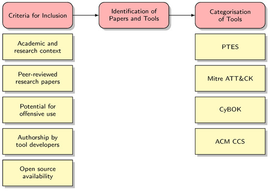 A three-step approach was devised to investigate Ethical Hacking tools developed by the research community over the past decade (Figure 1). First, clear guidelines were established to determine the inclusion of tools in the survey. Second, relevant papers and tools satisfying the above criteria were identified. Finally, these tools were categorised based on established cybersecurity frameworks.